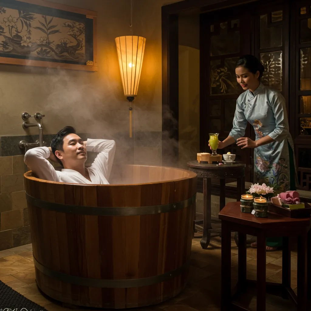 Phòng VIP là một không gian vừa riêng tư, vừa kích thích. Ánh sáng dịu nhẹ từ chiếc đèn lồng lụa treo trên trần, rọi xuống chiếc giường được phủ ga trải màu kem tinh tươm. Một bồn tắm gỗ được đặt ở góc phòng, cạnh cửa sổ nhìn ra vườn cây nhỏ xanh mướt. Hương tinh dầu sả chanh lan tỏa, kết hợp với âm nhạc không lời du dương, tạo nên một bầu không khí thư giãn tuyệt đối. Hùng chậm rãi cởi áo khoác, đặt chiếc túi nhỏ xuống ghế. Mai Lan vẫn giữ khoảng cách lịch sự, quan sát anh với ánh mắt đầy thấu hiểu.