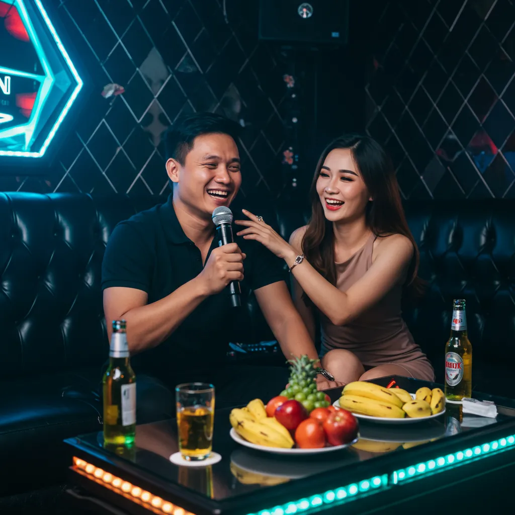 Điểm đến đầu tiên là quán karaoke 'Thiên Đường' – cái tên đã quá quen thuộc trong các bài review. Vừa bước vào sảnh, Hùng đã cảm nhận được một không khí hoàn toàn khác biệt. Lobby rộng rãi, ánh đèn vàng ấm áp, trang trí sang trọng và tiếng nhạc xập xình vọng ra từ những căn phòng kín. Mai dẫn Hùng vào một phòng VIP được đặt sẵn, không gian riêng tư, cách âm tốt và dàn âm thanh hiện đại. Sau khi gọi vài chai bia và đĩa hoa quả, Mai khẽ hỏi: