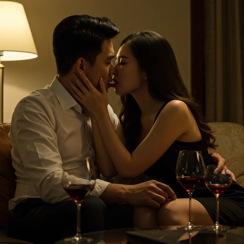 Nụ hôn sâu dần, Minh cảm nhận vị ngọt của rượu vang, của mật ngọt từ đôi môi cô. Lưỡi anh tìm kiếm, quấn quýt lấy lưỡi cô, tạo nên một bản giao hưởng của khoái cảm. Tay anh luồn qua mái tóc mềm mại của cô, giữ chặt lấy gáy. Tay cô không ngừng vuốt ve lưng anh, rồi dần dần trượt xuống thấp hơn, khám phá từng đường cong của cơ thể anh qua lớp áo sơ mi.