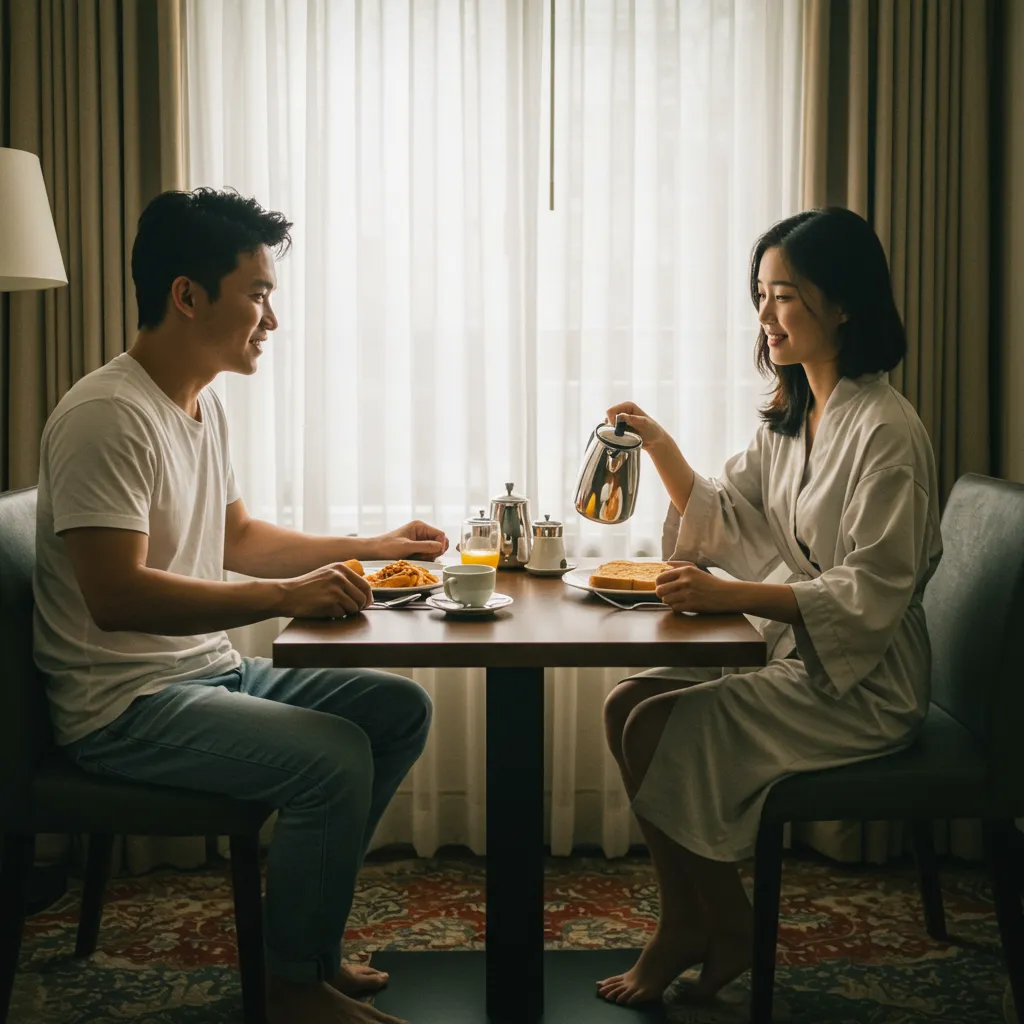 Lan Hương bật dậy, khoác chiếc áo choàng tắm mỏng rồi đi vào bếp nhỏ trong phòng. Không lâu sau, mùi cà phê thơm lừng lan tỏa khắp phòng, cùng với tiếng lách cách của tách đĩa. Cô đã chuẩn bị một bữa sáng nhẹ nhàng: cà phê và bánh mì nướng. Họ ngồi bên bàn ăn, ăn sáng trong im lặng, nhưng không hề gượng gạo. Sự im lặng đó chất chứa sự thấu hiểu, sự mãn nguyện sau một đêm đặc biệt.